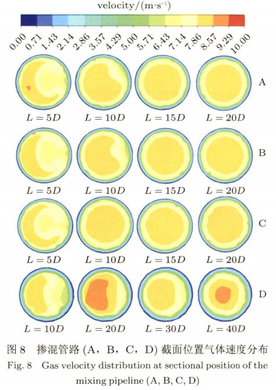 氣體摻混(hùn)後速度分布(bu)雲圖如圖16所(suo)示。管道尺寸(cun)的變化會😘導(dǎo)緻内部的氣(qi)體流動速度(dù)突變,使得氣(qì)體速度❌穩定(ding)🌈下來🌐所需🎯的(de)距🐆離更遠。摻(chan)混管路E,F,G,H均在(zài)約30D之後,速度(du)等高線形狀(zhuang)穩定下來,比(bi)單螺旋管(15D)的(de)截面距離大(dà)一倍。