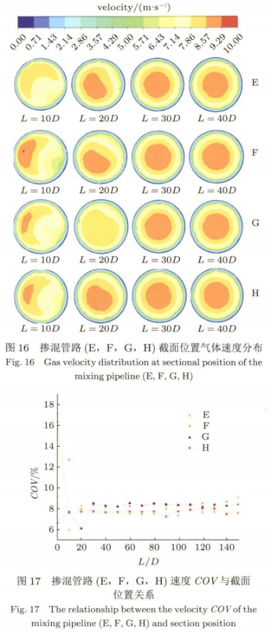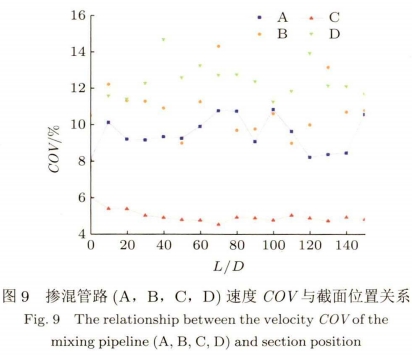 摻混管(guǎn)路(E,F,G,H)速度COV與截(jie)面位置的關(guān)系如圖17所示(shi)。初始截面位(wèi)🈲置時,摻混管(guan)路(E,H)的速度COV最(zuì)大,約爲17%。而随(sui)着截面位置(zhì)向管道🚩的下(xià)🐕遊移動,這四(si)種類型的摻(chan)混管路的速(su)度COV均穩定在(zai)8%附✊近。雖然♻️四(si)種類型的摻(chān)混管路最終(zhōng)穩定時的COV差(chà)别很小,但相(xiang)比摻混管路(lù)(E,F,G),摻混🐇管路(H)的(de)速度COV達到穩(wěn)定時所需的(de)距離最短,僅(jin)需10D。故摻混管(guǎn)路H爲💛最佳摻(chan)混模型。