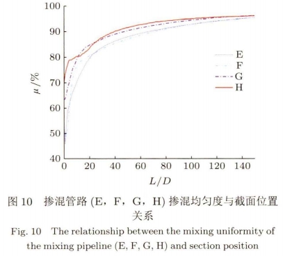 如(rú)圖10所示爲摻(chan)混管路(E,F,G,H)的管(guǎn)路内氣體摻(chan)混均勻度與(yu)截面位📧置❄️關(guan)系,摻混管路(lù)E,F,G,H是在單螺旋(xuan)的基礎上添(tiān)加變徑管(膨(peng)脹管或收縮(suo)管),分别在136D,132D,107D,96D處(chu)時實現氣㊙️體(tǐ)摻混均勻。相(xiang)比單螺🐇旋管(guǎn)的✏️146D,在不同位(wèi)置添加任何(he)變徑管💋均能(néng)在.不🔅同程度(dù).上實現縮短(duan)摻混距離的(de)效果。将變徑(jìng)管置于單螺(luó)旋管之前🍉氣(qi)體初步摻混(hùn)後再進入單(dān)螺旋管進一(yi)步摻混,明顯(xiǎn)比置于單👈螺(luó)旋管之後更(gèng)能有效地縮(suō)短摻混。而氣(qi)體進入收💜縮(suō)管内流動速(su)度會📧增大,此(ci)時的擾動更(gèng)🚶加劇烈,有助(zhu)于氣體摻混(hùn)。針對變徑管(guǎn)位置及類型(xíng),摻混管路🈲H(即(jí)前收縮.管)的(de)摻混效果更(geng)好。