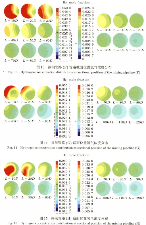 對(duì)比圖12~圖15,四種(zhǒng)類型摻混管(guǎn)路的管道截(jié)面氫氣濃度(du)變化💔規律很(hen)相似。在螺旋(xuan)管道出口.處(chu)氫氣均存在(zài)明顯的左右(yòu)分層現象。但(dan)随着距離的(de)增加,最終均(jun1)能達到摻混(hùn)均勻,氫氣基(jī)本不再有分(fen)層的狀态。但(dàn)不同類型管(guan)道達🈲到此狀(zhuang)态所需的距(ju)離不一。如圖(tú)12所示摻混管(guǎn)路E需約130D~140D的距(jù)離才能達💋到(dào)此狀态,此時(shí)氫氣摩爾分(fen)數約爲0.9%;圖13所(suo)示的摻混管(guan)路F同♊樣需💃🏻約(yuē)130D~140D的距離達到(dao)此狀态,此時(shi)氫氣摩爾分(fèn)數比摻混管(guan)路E略大,約爲(wèi)1%;圖14所示的摻(chan)混管路G需約(yuē)100D~110D的距離達🛀到(dao)此狀态,此時(shi)氫氣摩爾分(fen)數約爲1.2%;圖15所(suǒ)示的摻混🏒管(guǎn)路H需約90D~100D的距(ju)離達到此狀(zhuàng)态,此時氫氣(qi)摩爾分數✍️約(yue)爲1.6%。