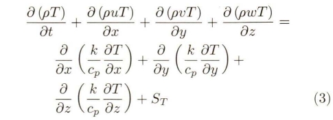 式中(zhong),k爲流體傳熱(rè)系數,Cp爲比熱(rè)容,T爲溫度,St爲(wei)流體内熱源(yuan)和因黏性作(zuò)用流體機械(xie)能轉化爲熱(re)能部分。