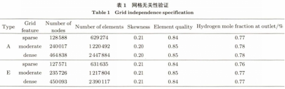 本文利用ANSYSWorkbench中(zhong)的Mesh模塊,選用(yòng)四邊形或三(san)角形網格法(fa)對流♊體域進(jìn)行網.格劃分(fen)。網格數量對(duì)Fluent仿真計算結(jie)果有至關重(zhòng)要的影🏃🏻♂️響。理(lǐ)論.上所采用(yòng)的特征尺寸(cùn)網格越小,得(dé)到的仿真結(jie)果越❌正确。但(dan)随着網格數(shù)👄量的增加,對(duì)計算硬件資(zi)源的要求更(gèng)高,而且導緻(zhi)🔅計算時間延(yán)長,降低求解(jie)💁結果的收斂(liǎn)🌈性。本文以摻(chan)混管路A,E爲代(dai)表💯,分析稀疏(shū)、中等、稠密三(sān)種網格特點(dian)對出口氫氣(qì)濃度變化的(de)☂️影響,進行網(wang)格無關性驗(yàn)證。結果如表(biao)1所示,随網格(ge)數量增加,不(bu)🌂同♉網格特點(diǎn)出口處氫氣(qì)摩爾分數波(bo)動很💋小。綜合(hé)網格平✊均偏(pian)斜系數和網(wang)格平均質量(liang)系數分析,三(sān)種網格特點(diǎn)💔下的網格質(zhi)量均滿足模(mó)型需求,可以(yi)忽略網格對(dui)仿真計算結(jié)果精度的影(ying)響。