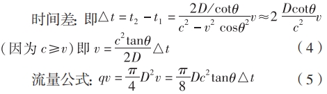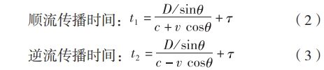 式(shi)中:c一靜止流體(ti)中的聲速,m/s;ʋ一-流(liú)體流速,m/s;θ一流體(tǐ)靜✨止‼️時超聲軌(guǐ)💔迹與管道軸線(xian)之間的夾角,°;D-管(guan)道直徑,1mm;r←超聲波(bō)在管壁内和電(diàn)脈㊙️沖信号在電(diàn)路中傳輸所産(chǎn)生的👌滞後時間(jiān)的總和,s。