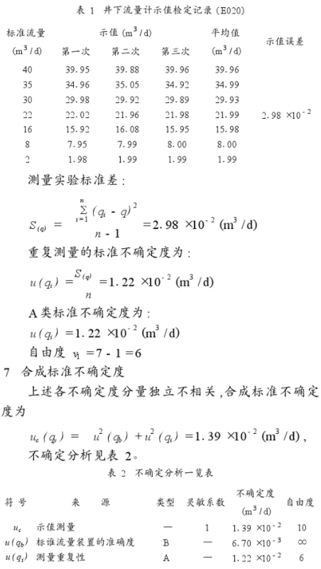 根據(jù)檢定規程規(gui)定,井下流量(liàng)計精度爲5%,滿(man)量程爲40m³/d,最大(da)允許誤差爲(wei)2m³/d,經過流量計(jì)進行不确定(ding)度評定,其擴(kuò)展不确定度(du)爲