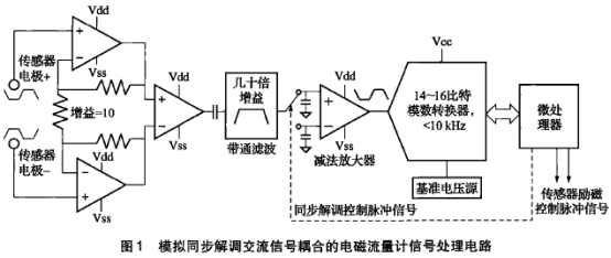 現代工(gong)業電磁(cí)流量計(ji)從20世紀(jì)50年代産(chan)品問世(shì)以來随(sui)着電💞子(zǐ)技術和(he)計算機(jī)技術的(de)發展逐(zhu)漸成熟(shu)完💋善和(hé)智能化(huà),智🔱能化(huà)的重👨❤️👨要(yào)标志是(shi)微處理(lǐ)器的使(shi)用。電磁(cí)流量傳(chuan)感器輸(shū)出的高(gao)💛内阻、高(gāo)共模且(qie)微弱🏃♀️的(de)有用信(xìn)号不能(neng)被微處(chù)理器直(zhí)接接受(shòu),需要模(mó)數轉換(huan)器首先(xian)♍對傳感(gan)器輸出(chū)的模拟(nǐ)信😘号進(jin)行數字(zi)🌈化。直到(dào)21世紀初(chu)🈲之前工(gong)業用途(tu)的分辨(biàn)率高、低(di)🎯噪聲模(mó)數轉換(huan)器仍是(shì)稀少和(hé)昂貴的(de)商🔞品,所(suo)以傳感(gan)器信💃🏻号(hao)必需被(bèi)放大數(shu)百至上(shang)千倍後(hou)再🔆數字(zi)化,從而(er)可以使(shi)用成本(ben)較低同(tóng)時分辨(biàn)率也較(jiao)低的模(mó)數轉換(huan)器。從20世(shi)紀的工(gong)業電磁(ci)流量計(jì)産品進(jìn)化來的(de)、目前仍(réng)然很常(cháng)見的信(xìn)号處理(li)電路通(tōng)常包括(kuò)前置放(fàng)☁️大,後級(jí)放大,帶(dài)通濾波(bo),采樣保(bao)🐪持,模數(shù)轉換等(děng)。如圖1所(suo)示:微伏(fu)💛級的信(xìn)号被前(qian)置放大(dà)器放大(dà)約十倍(bèi)後交流(liú)耦合至(zhi)後📱級;接(jie)🏃🏻♂️着使用(yòng)帶通濾(lǜ)波器把(bǎ)信号進(jìn)一步放(fang)大幾十(shi)倍近伏(fu)級。被放(fàng)大近伏(fú)級的信(xin)号經過(guo)微🌈處理(li)器😘控制(zhi)的采樣(yang)保持電(diàn)路濾除(chu)尖峰,變(bian)成緩慢(màn)的直流(liu)信号送(song)入模數(shu)轉換器(qi)。該方法(fa)對模數(shu)轉換器(qi)的性能(néng)要求不(bu)高,通常(cháng)14~16比特的(de)分辨率(lü)和幾千(qian)赫茲的(de)輸出數(shù)據率即(jí)可。它的(de)優點是(shì)🐅成熟穩(wěn)定🌈和被(bèi)廣泛驗(yan)證,缺點(diǎn)是放大(dà)電路級(ji)數較多(duo)、增益倍(bèi)😄數較高(gao)造成電(dian)路結構(gòu)複雜,容(rong)易振蕩(dang),線性⚽損(sun)失,過長(zhǎng)的低通(tong)濾波時(shi)間常數(shù)會影響(xiang)對流量(liàng)階躍變(bian)化做出(chū)迅速響(xiǎng)應,另外(wài)在物料(liào)成本、功(gōng)耗🔅、電路(lu)尺寸、可(ke)靠性等(děng)方🔞面也(ye)有劣勢(shì)。