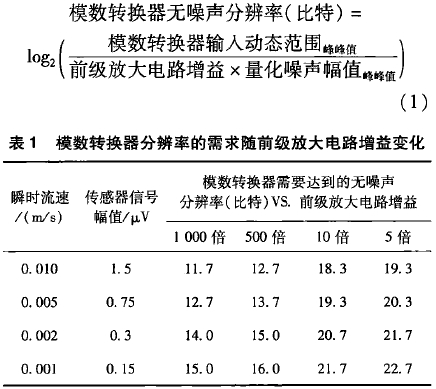 電磁流(liu)量傳感(gan)器的響(xiang)應通常(cháng)爲150 μV/( m/s)到200μV/(m/s),因(yin)爲調制(zhi)勵磁🈲電(dian)🛀🏻流的換(huàn)向,傳感(gan)器的輸(shu)出信号(hao)幅值加(jia)倍。以150 μV/( m/s)(300 μV峰(fēng)峰值)響(xiǎng)應爲💰例(lì),對0.3~15 m/s流速(su)的量㊙️程(chéng)範圍,傳(chuan)感器輸(shu)出信号(hào)幅值在(zài)90 μV峰峰值(zhi)到4.5 mV峰峰(fēng)♈值之間(jiān)⛷️。保證流(liú)速信号(hào)被模數(shu)轉換器(qì)正确分(fèn)辨🧑🏽🤝🧑🏻的最(zuì)低要求(qiú)是出現(xian)在模數(shu)轉換器(qi)輸人端(duān)的傳感(gan)器信㊙️号(hào)幅值不(bu)得☂️大于(yu)模數轉(zhuǎn)💋換器噪(zào)聲的一(yī)☔半。模數(shu)轉換器(qi)無噪聲(shēng)分辨率(lǜ)的計算(suàn)公式如(ru)式(1)所示(shi)。瞬時流(liu)速對應(ying)的傳感(gan)器信号(hào)幅值可(ke)被當作(zuò)對模數(shù)㊙️轉換器(qi)噪聲的(de)最低要(yào)求。由表(biao)🔞1可見前(qián)級放大(dà)電路增(zeng)益越低(dī)‼️對模數(shu)轉換器(qì)的無噪(zào)聲分辨(biàn)率指标(biao)的要求(qiu)越高。這(zhè)是20世紀(ji)⚽後期數(shù)十🏃♀️年裏(lǐ)在缺少(shǎo)成本可(kě)負擔、高(gao)分辨率(lǜ)的模數(shù)轉換器(qì)的條件(jiàn)下,
