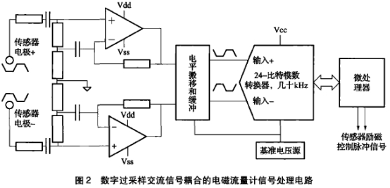 電(diàn)子進步(bù)使得在(zài)本世紀(ji)初開始(shi)出現越(yuè)來越多(duo)性價🙇♀️比(bǐ)更好的(de)低噪聲(shēng)24比特模(mó)數轉換(huàn)器産品(pin)。随之出(chu)現的數(shù)字😘過采(cai)樣交流(liu)信号耦(ǒu)合放大(da)是一種(zhǒng)改進的(de)電路結(jié)構。如圖(tú)2所示傳(chuán)感器㊙️電(diàn)極輸☂️出(chu)信号使(shi)用電容(rong)耦合,在(zai)前置放(fang)🏃大級采(cǎi)用自舉(ju)電路提(ti)高輸人(rén)阻抗,真(zhēn)差分輸(shu)出到模(mó)數轉換(huan)器。省略(luè)模拟帶(dài)通放大(dà)、采樣保(bao)持😍等電(dian)路。較高(gāo)速的模(mo)數轉換(huàn)器對🈲前(qian)置放大(dà)器的輸(shu)出做過(guò)采樣。微(wei)處理器(qì)在數字(zì)域内重(zhong)建流速(sù)信号波(bō)形、同步(bu)解調交(jiao)流信号(hao)🧡、濾除尖(jiān)峰和噪(zao)聲,計算(suàn)流速信(xin)号。該電(dian)路與前(qian)一-種電(dian)路相比(bǐ)的優點(dian)是:更少(shǎo)的元件(jian),更低的(de)價格,真(zhēn)差分信(xìn)号的抗(kang)幹擾,接(jiē)受較寬(kuan)的輸人(ren)共模電(dian)壓範圍(wéi)。