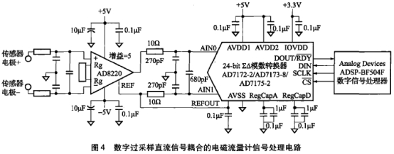 本(běn)文電磁(ci)流量轉(zhuǎn)換器信(xin)号處理(lǐ)電路如(ru)圖4所示(shì)。電💋磁流(liu)量傳🔅感(gǎn)器的一(yī)對電極(jí)輸出經(jīng)過射頻(pín)濾波阻(zǔ)容網絡(luo)直流耦(ǒu)合至🈲±5V供(gòng)電的AD8220結(jié)型場效(xiào)應管輸(shū)入儀表(biao)放大器(qì)輸入端(duān)。AD8220的增🛀益(yì)設置爲(wèi)5倍,參考(kǎo)電平管(guan)腳🌈連接(jie)到AD7172-2模數(shu)轉換器(qi)的2.5 V内部(bu)基準源(yuán)輸出,把(ba)儀放輸(shū)出信号(hào)的電平(píng)擡高至(zhì)正🚶極性(xing)。被AD8220調理(li)後的傳(chuán)感器🏃🏻信(xin)号直流(liú)耦合至(zhi)+5 V供電的(de)AD7172-2第0号輸(shū)人通道(dao),AD7172-2的2.5V内部(bù)基準源(yuán)輸出✔️接(jiē)第1号🤩輸(shū)人通道(dao),兩個通(tong)道組成(cheng)0~5 V僞差分(fen)輸人。AD7172-2 的(de)輸出數(shu)據率設(shè)爲31 250 Hz ,數字(zì)量化後(hou)的樣點(dian)送入ADSP-BF504F數(shù)字信号(hao)處理器(qi)進行同(tóng)步解調(diao)數字濾(lü)波和流(liú)量計算(suàn)、線性化(hua)補償、電(diàn)流或脈(mò)沖輸出(chu)等處理(li)。該方案(an)試圖吸(xī)取數字(zì)過采樣(yang)交流信(xìn)号耦合(he)的電磁(cí)流量計(ji)信号放(fang)大電路(lù)優點的(de)同時避(bì)免其共(gong)模抑制(zhi)比損失(shī)的缺✏️點(dian)。通過使(shǐ)用比傳(chuán)統方🐪案(àn)低一到(dao)二百倍(bèi)的模拟(ni)增益并(bìng)結合軟(ruǎn)件的方(fāng)法解決(jue)直流耦(ou)合帶🆚來(lai)的信号(hao)飽和問(wen)題。因爲(wei)放大器(qi)增益隻(zhī)有5倍, ±5 V供(gòng)電💯的AD8220的(de)軌到軌(guǐ)電壓輸(shu)出範🔞圍(wei)的上限(xian)是4.8V,單5V供(gong)電且集(jí)成真軌(guǐ)到軌🌈輸(shū)人緩沖(chong)器的AD7172-2的(de)輸人電(diàn)壓範💰圍(wei)是0~5 V。所以(yǐ)放大器(qì)輸人動(dong)态🔞範圍(wei)等于(4.8-2.5) +5=0.46(V),折(shé)合150 μV/(m/s)響應(yīng)的傳感(gan)器在3 067 m/s流(liu)速的輸(shū)出(這僅(jǐn)是理論(lùn)值,實際(ji)流速不(bú)可能🐕這(zhe)麽高)。這(zhe)表明該(gai)電路設(she)計能夠(gou)處理極(ji)寬廣的(de)流速範(fan)圍。該電(diàn)路的非(fei)線性誤(wu)差由♍儀(yí)表放大(dà)器🍓和模(mo)數🔴轉💛換(huàn)器的非(fei)線性低(dī)指标共(gòng)同決定(ding)。AD8220和AD7172-2的數(shù)據手冊(cè)标稱其(qi)非線性(xing)誤差典(dian)型值分(fèn)别是5PPM和(he)±2PMM,所以該(gai)電路設(shè)計具有(yǒu)線性佳(jia)。