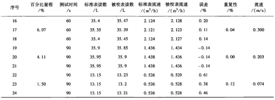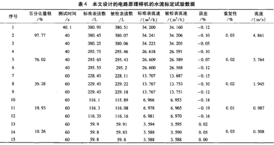 試(shi)驗條件(jiàn):傳感器(qi)50mm口徑,電(diàn)極材料(liào)316L不鏽鋼(gāng),傳感器(qì)系數♻️1.1089,常(chang)溫⛹🏻♀️常壓(yā)📱水,電子(zǐ)秤稱重(zhòng)法。進行(hang)系統零(ling)點和滿(mǎn)量程校(xiào)正,未做(zuo)🌐逐點非(fēi)線性校(xiào)正。表4說(shuō)明本文(wen)的方案(àn)在0.5 ~5m/s的🏃流(liú)速範圍(wei)内的🌈測(ce)量結果(guǒ)達到±0.2%的(de)示數誤(wù)差📐,重複(fú)性優于(yú)萬分之(zhī)四。