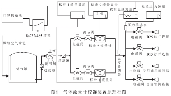 系(xì)統原理框圖如(ru)圖1所示,氣源采(cǎi)用壓縮空氣,經(jīng)過一個1m3的儲氣(qi)罐來獲得穩定(ding)的氣流,出氣口(kou)加裝一級過濾(lü)和👅除濕♉裝置;爲(wèi)适☎️應不同接口(kou)流量計校準要(yào)求,配置了4路輸(shu)出接口,其中2路(lù)爲D25和♍D15法蘭盤連(lian)接,其餘兩路爲(wèi)“塔形”接✔️口和專(zhuān)用減壓閥連接(jie),這4路氣㊙️路輸出(chu)接口💛基本可滿(man)足常用流量計(ji)校準不同的檢(jiǎn)測管路全部通(tong)過在面闆、上的(de)按鈕選擇,通過(guò)控制電磁閥切(qiē)換,并由在面🎯闆(pan).上的指示燈顯(xian)示。顯示儀表全(quan)部采用數字🈲儀(yí)表,且均帶有數(shù)字通信接口,全(quan)部采集數據均(jun)可通過串口輸(shū)送至計算機,計(jì)算🛀🏻機程序完成(chéng)數據☔采集存儲(chu)、檢測結論判斷(duàn),原始數據存檔(dang)、檢定報告的自(zì)動😄形成和打印(yìn)輸出;主設備的(de)各🈲管路切換和(he)氣路的開關可(ke)獨立完成,流量(liàng)、溫度、壓力參💞數(shù)均可正常顯示(shi)。因此,主機在無(wu)計算機參與的(de)情況下,同樣可(ke)完成校準工作(zuò),隻是需要手工(gōng)記錄換算。