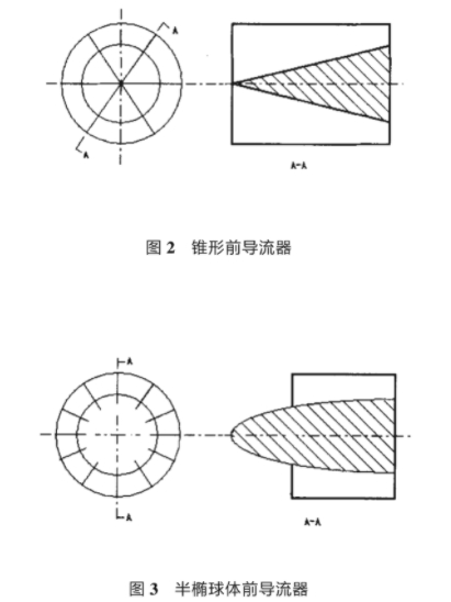 圖2和圖3分(fen)别爲兩種結構的(de)前導流器示意圖(tu)。圖2爲渦輪流量計(ji)常用結構,葉片數(shù)爲6導流.體形狀由(yóu)流入至流出呈錐(zhuī)✂️形,葉片長與錐體(tǐ)高度相同.圖3爲本(ben)文改進的前導流(liu)器結🤩構示意圖其(qí)主要特點是将錐(zhui)體改爲💜半橢球體(ti),葉片數增加到12并(bìng)把葉片長度縮小(xiǎo)1/3.