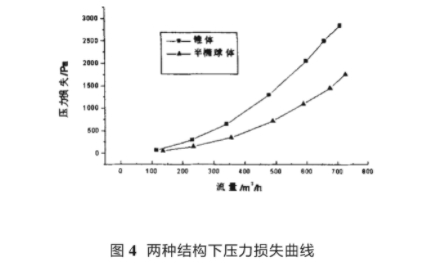圖4是兩種結構下(xia),流體經過流量計(ji)後的壓力損失曲(qu)線。由圖4可看出在(zài)流量<100m³/h時,壓力損失(shī)不受導流器結構(gòu)的影♋響而且壓損(sǔn)很小。随着流量增(zeng)大,改進的導流器(qi)🤩的壓損明顯低于(yu)錐體導流器在最(zuì)大流量🏒600m³/h處錐體的(de)壓損約爲半橢球(qiu)體的2倍,可見🚶♀️導流(liu)器的結構對流量(liàng)計壓力損失有不(bu)容忽視👣的影響作(zuo)用。