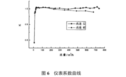 圖(tu)6爲分别采用錐體(ti)和半橢球體導流(liu)器,流量計儀表系(xì)數的測試結果。由(you)圖可看出采用改(gai)進的導流器後流(liu)量👅計儀表系數比(bǐ)🌍改進前有較好地(dì)改善在量程範圍(wéi)内50m³/h~600m³/h),K很🐇好地體🚩現常(cháng)系💯數的特性甚至(zhi)在超過最大量程(cheng)後能繼♍續保持水(shuǐ)平直線狀态。改進(jin)前🏃🏻的流量計K值🛀🏻也(ye)較好,但随着流量(liàng)增大💋直線略向下(xià)傾斜偏離了水🚶♀️平(píng)位置。