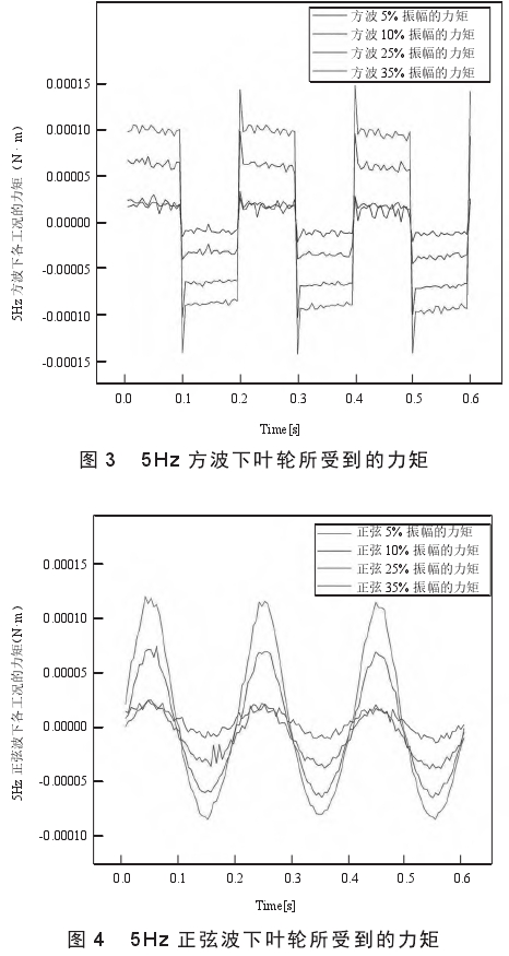 圖3~圖4分(fèn)别是5Hz時(shi)方波、正(zheng)弦波脈(mo)動流下(xià)葉輪,所(suo)受力矩(jǔ)🛀。除了流(liú)量突變(biàn)點外,葉(ye)輪所受(shòu)力矩與(yu)流量波(bō)形近似(si)。