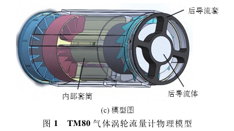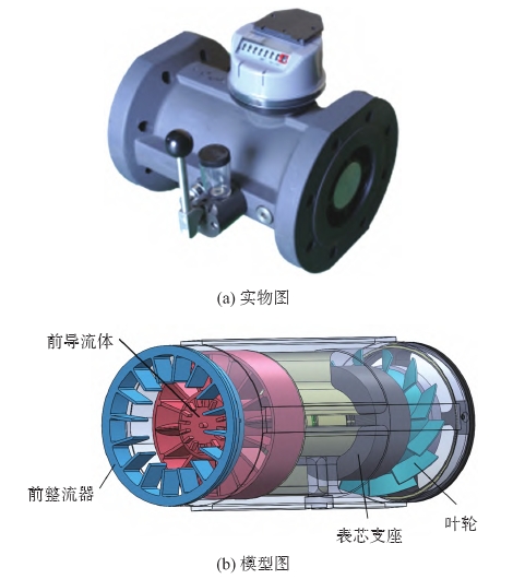 以氣體渦(wo)輪流量計爲(wèi)研究對象,流(liu)量計的結構(gòu)主要由前整(zhěng)流器、前導流(liu)體、葉輪、表芯(xīn)支座、後導流(liú)體以及殼體(ti)等組成,其物(wu)理模型如圖(tu)1所示。流量計(ji)的前整流器(qi)采用葉栅結(jie)構,葉栅數爲(wèi)16;前導流體由(yóu)第二級16片葉(yè)栅(與前整流(liú)器葉栅呈11.5°夾(jiá)角)和80mm長的圓(yuán)柱結構組成(cheng);表芯支座用(yong)于固定葉輪(lun),葉輪的葉片(piàn)數爲12,螺旋角(jiao)爲45°;後導流體(tǐ)置于葉輪之(zhi)後,用于穩定(dìng)出口處的氣(qì)流。
