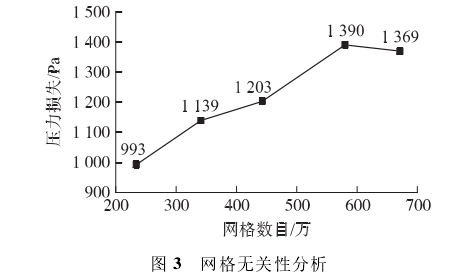 根據氣體渦(wo)輪流量計的(de)結構設計圖(tú)紙,運用SolidWorks軟件(jian)對各部分零(ling)件進行組裝(zhuang)建模,将建好(hǎo)的模型導入(ru)ANSYSWorkBench進行網格劃(hua)分。采用分塊(kuài)化方法劃分(fen)網格,直管段(duàn)采用結構化(huà)網格;由于葉(yè)輪和後導流(liú)體的結構更(geng)爲複雜,采用(yòng)非結構混合(he)網格,并對其(qí)進行細化處(chù)理,最後進行(hang)網格無關性(xing)驗證,如圖3所(suǒ)示。當網格數(shù)量爲580萬與670萬(wàn)時,兩者的壓(ya)力損失相差(chà)僅爲21Pa,故本文(wen)選取580萬網格(ge)數量進行後(hou)面的數值模(mo)拟研究。