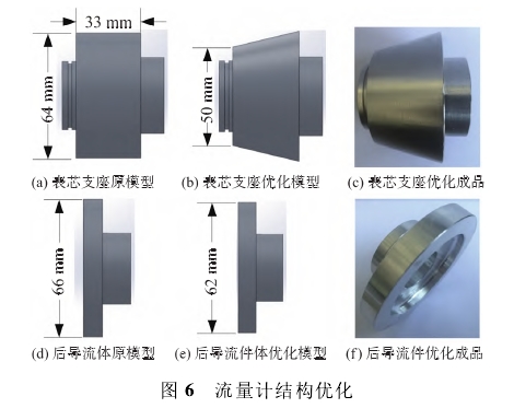 基于流(liú)量計流場特(tè)征的分析,将(jiang)原來的表芯(xin)支座和後導(dǎo)流體結構進(jìn)行改進設計(ji)。首先,表芯支(zhi)座迎風面一(yī)側的直徑從(cóng)64mm縮減至50mm,如圖(tu)6(a-b)所示,運用所(suǒ)形成的18.5°坡度(du)來減緩流體(tǐ)的壓力梯度(du)變化,從而減(jiǎn)少流量計的(de)壓力損失。其(qí)次.對後導流(liú)體的直徑進(jin)行縮減,如圖(tú)6(d)~圖6(e)所示,直徑(jing)從原來的66mm減(jian)至62mm,以減小對(dui)流出葉輪流(liu)體的阻礙。最(zui)後,運用3D打印(yin)技術,制作優(yōu)化後的表芯(xin)支座和後導(dǎo)流體模型成(chéng)品,如圖6(c)、圖6(f)所(suo)示。