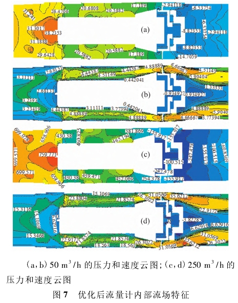 爲驗證改進(jìn)方案的可行(hang)性,對改進模(mo)型進行仿真(zhen),從流場的角(jiǎo)度分析其優(you)化效果。流量(liàng)點同樣選取(qǔ)50m3/h、250m3/h作爲分析對(dui)象,流量計内(nèi)部流場特征(zheng)如圖7所示。從(cóng)結構整體優(yōu)化的模拟結(jie)果可以看出(chū):由于改變了(le)表芯支座的(de)坡度使得氣(qi)流更加平緩(huan),其迎風面高(gāo)壓區減小,側(ce)面的負壓區(qū)消失,壓力梯(tī)度驟變的情(qing)況得到緩解(jie);後導流體下(xià)遊區域流場(chǎng)紊亂的現象(xiàng)也得到明顯(xiǎn)改善,壓力分(fen)布變得更均(jun1)勻;尾迹區域(yu)的面積減小(xiao),尾迹耗散引(yǐn)起的能量降(jiàng)低;流量計出(chu)口處的壓力(lì)梯度變化更(gèng)均勻,後導流(liú)體的導流效(xiao)果明顯提升(shēng);總壓,力損失(shi)明顯降低,在(zai)50m3/h流量點降低(di)了約46.2%,在250m3/h流量(liang)點降低了約(yuē)45.8%。