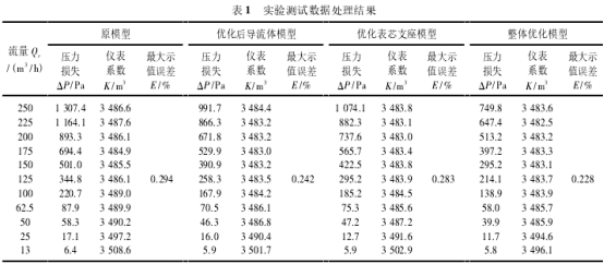 爲進一步驗(yan)證結構改進(jìn)效果,用優化(huà)後的表芯支(zhi)座和後導流(liu)體成品模型(xíng)代替原模型(xíng)中的表芯支(zhi)座和後導流(liú)體結構,安裝(zhuāng)進氣體渦輪(lun)流量計進行(háng)實驗測試。根(gen)據《渦輪流量(liang)計檢定規章(zhang)》,通過重複實(shí)驗獲得多組(zu)實驗數據,數(shu)據處理後得(de)到流量計的(de)壓,力損失、儀(yi)表系數、最大(da)示值誤差等(deng)性能指标,進(jìn)而評價流量(liang)計的結構優(you)化效果及其(qí)計量性能。表(biao)1所示爲實驗(yàn)測試的數據(jù)處理結果。