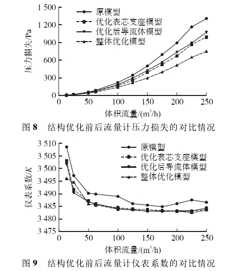 首(shou)先,對結構優(yōu)化前後流量(liàng)計壓力損失(shī)的實驗結果(guo)進行分析。圖(tú)8表示原模型(xíng)、優化表芯支(zhi)座模型、優化(hua)後導流體模(mo)型,以及整體(tǐ)優化模型的(de)壓力損失随(sui)着流量變化(huà)的規律。随着(zhe)流量的增大(da),所有流量計(ji)模型的壓力(li)損失均呈明(ming)顯增大趨勢(shì)。兩個結構優(you)化方案均對(duì)壓力損失的(de)降低起到了(le)作用,當流量(liang)爲250m3/h時,整體優(you)化模型将壓(yā)力損失降低(di)至.749.8Pa,降低幅度(dù)約42.6%,有效地減(jiǎn)少流量計在(zai)使用過程的(de)能耗,提高了(le)流量計的性(xìng)能。
