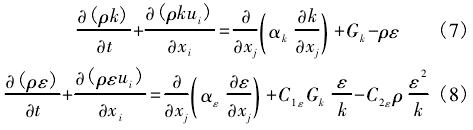 式中:Gk表示平(ping)均速度梯度(dù)所産生的湍(tuan)流動能.αε,αk分别(bié)表示ε和h的擴(kuò)散率,C1ε、C2ε爲系數(shù)。