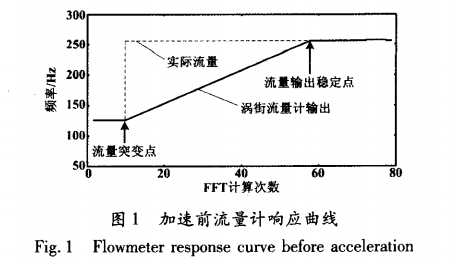 采用頻(pín)譜估計方法(fǎ)分析渦街信(xìn)号的頻率是(shi)基于渦街流(liú)量計信号是(shì)一個平穩随(suí)機過程信号(hao),并且流量在(zài)短時間内是(shì)穩定的或變(bian)化很小。由于(yú)渦街流量計(jì)輸出信号實(shi)時性的要求(qiu),隻能對有限(xiàn)長時間段内(nèi)的信号進.行(háng)處理,即隻能(néng)截取一段數(shu)據進行頻譜(pu)分析。爲了防(fang)止數據統計(ji)變異性對計(jì)算渦街頻率(lü)的影響,必須(xū)對若幹次頻(pin)譜分析的結(jie)果進行平均(jun1),這就需要花(huā)費時間。當平(píng)均次數多時(shí),數字渦街流(liu)量計的響應(yīng)速度就會顯(xian)得比較慢。例(lì)如,我們的系(xì)統采用時鍾(zhong)頻率爲40MHz的TMS320LF2407ADSP芯(xīn)片,使用彙編(biān)語言編制FFT程(cheng)序計算渦街(jiē)信号的頻譜(pǔ),對50次計算結(jie)果進行平均(jun1)。每次FFT計算時(shí)間大概是300ms(包(bāo)括信号處理(lǐ),人機接口等(deng)對應的其他(ta)軟件執行時(shí)間),總用時大(da)概爲15s,這個時(shí)間比較長。若(ruò)在這段時間(jian)裏,流量發生(shēng)突然變化,系(xi)統就需要計(ji)算50次FFT,才能反(fǎn)映流量的變(biàn)化,這将造成(cheng)測量誤差,如(ru)圖1所示。
