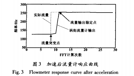 圖3爲經過(guò)加速處理後(hòu)40口徑渦街流(liú)量計在流量(liàng)突變時的響(xiǎng)應曲線。可見(jiàn),在流量突變(biàn)後,系統經過(guo)3次FFT計算就能(neng)跟上流量的(de)變化,有效地(dì)提高了流量(liang)計的響應速(su)度。