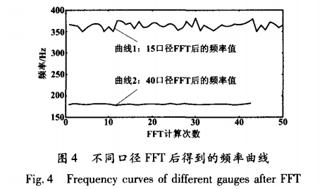 在小流量(liang)的時候渦街(jiē)流量計信号(hào)微弱,信噪比(bǐ)降低,信号質(zhi)量比較差,頻(pin)譜分析得到(dao)的渦街頻率(lǜ)波動比較大(da)。特别是小口(kou)徑渦街流量(liàng)計,由于傳感(gan)器安裝等原(yuán)因,這種現象(xiang)更爲明顯。圖(tu)4中,曲線1爲15口(kou)徑渦街流量(liang)計在下限頻(pín)率附近,每次(ci)FFT計算得到的(de)渦街頻率;曲(qu)線2爲40口徑離(li)下限頻率比(bi)較遠時每次(ci)FFT計算後得到(dao)的渦街頻率(lü)。可見,曲線1波(bō)動較大,數值(zhí)約爲30Hz。此時,即(jí)便采取平均(jun)措施,也無法(fǎ)使輸出頻率(lü)值穩定。
