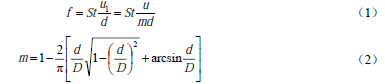 式中u1爲(wei)旋渦發(fa)生體兩(liǎng)側的平(ping)均流速(su),m/s;St爲斯特(te)勞哈爾(ěr)數,量綱(gāng)爲1;m爲旋(xuan)渦發生(sheng)體兩側(ce)弓形面(miàn)積與管(guan)道橫截(jie)面面積(ji)之比,量(liang)綱爲1。