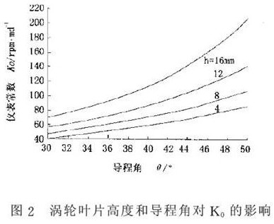 式2可見(jian),對确定(dìng)的渦輪(lún)流量傳(chuan)感器)易(yi)知口徑(jing)D大, K0值小(xiao),葉片數(shù)n大, K0值大(da)等.如果(guǒ)要獲得(de)較大的(de)儀表常(chang)數,就要(yào)對渦輪(lun)傳感器(qi)的結構(gòu)參數進(jìn)行優化(hua)設計,從(cong)㊙️圖2(可以(yǐ)⭐看出,葉(ye)片高度(du);增加, K0增(zeng)大,導程(cheng)角增大(da), K0增大🚩.對(duì)于¢19的過(guò)環空大(da)排🤟量液(ye)體渦🤞輪(lun)流量計(ji)而言,由(yóu)上式計(ji)算得K0=74.567rpm/m3/d而(ér)水中标(biāo)定的KW=78.89rpm/m3/d,表(biǎo)1給出不(bú)同口徑(jing)和不同(tong)導程角(jiǎo)下液🌂體(ti)渦輪流(liu)量計固(gù)有儀表(biao)常數的(de)計算值(zhí).