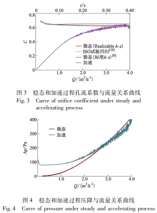 對(dui)于流量(liang)Q≤0.6m3/h,C0随流量(liang)的增加(jiā)緩慢下(xià)降,之後(hou)保持在(zai)0.63左右.與(yu)C0不同的(de)是,C從0開(kāi)始随流(liú)量的增(zēng)大而增(zeng)大,并逐(zhu)漸向C0靠(kao)近👄,直至(zhi)Q≥3.5m3/h後才🔆達(dá)到C0的水(shui)平.C在時(shi)間上滞(zhi)後于C0.圖(tú)4中△p-Q曲線(xian)顯示,Q≤3.0m3/h時(shi),加速過(guò)程孔闆(pan)前後壓(ya)降高于(yu)同等流(liú)量下💜穩(wěn)态壓降(jiang);Q≥3.0m3/h後,瞬态(tài)壓降才(cai)降爲穩(wen)态水平(píng).