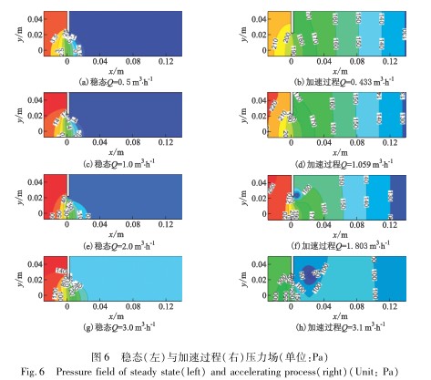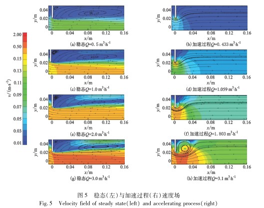 從(cóng)内流角(jiao)度分析(xī)導緻第(dì)2.1節中C和(hé)C0不同的(de)原因,圖(tú)5和🙇♀️圖6分(fen)别給出(chū)并對比(bǐ)了相同(tóng)流量下(xià)穩态和(he)加速過(guo)程中流(liu)經🔴孔闆(pǎn)前後流(liú)體的速(sù)度和壓(yā)力場.對(dui)于Q≤3.0m3/h穩态(tai)條件,孔(kong)闆後方(fāng)始終可(ke)觀察到(dao)一個被(bei)拉長的(de)主渦和(hé)孔闆右(you)上方的(de)小渦,流(liu)動的損(sun)失較大(da),同時表(biǎo)明流場(chǎng)中已形(xíng)成穩定(dìng)的流動(dòng)通道,動(dong)💜能和壓(yā)能的轉(zhuan)化已達(da)到平衡(heng),流動的(de)損失🔞(長(zhang)漩渦)也(yě)趨于穩(wen)定,并且(qie)壓差随(sui)流量的(de)增大而(er)穩定增(zeng)大.